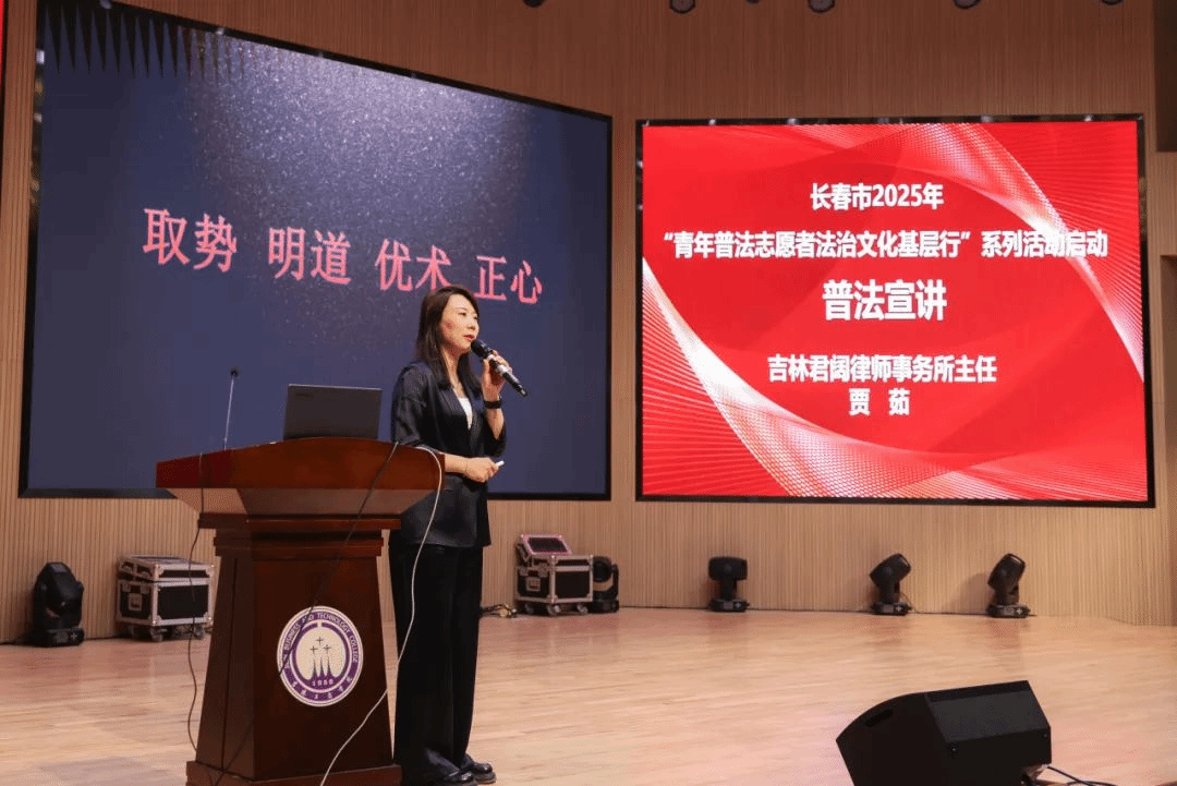 为深入学习习近平新时代中国特色社会主义思想,以依法治校理念为引领,提升治理效能、保障学生权益,5月20日,我校联合长春市法学会在博学楼117报告厅举行普法讲座。长春市2025年“青年普法志愿者法治文化基层行”活动启动仪式暨“法护青春·就业引航”首场宣讲会同步举行。长春市法学会专职副会长李志国、吉林君阔律师事务所主任贾茹,长春市法学会、长春市司法局、长春市团委、长春市总工会等单位的领导和同志,学校师生共计230余人参加了活动。副校长董本云出席宣讲会,会议由发展规划与政策法规处处长李凤祥主持。